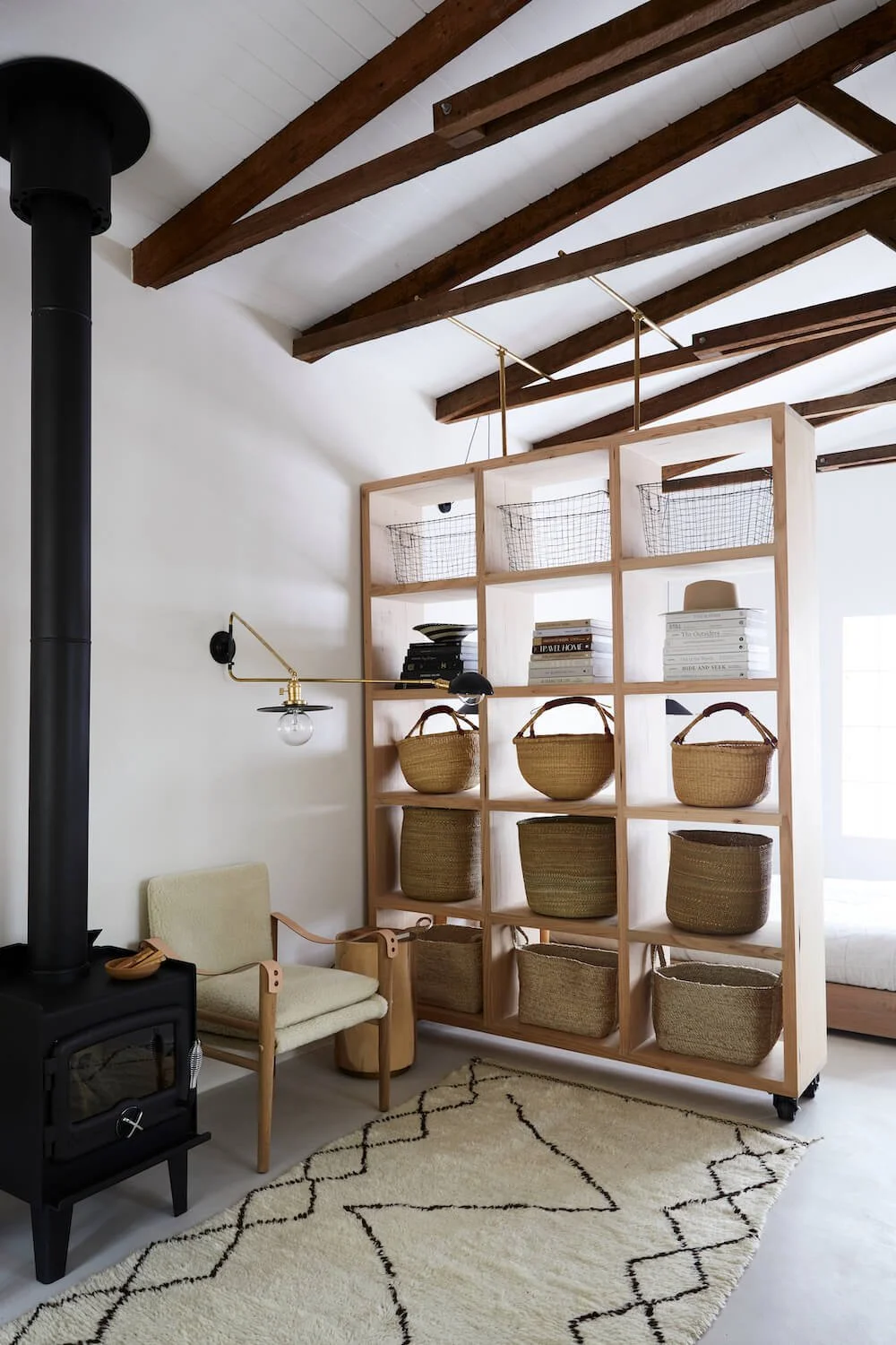 When you have one large open-plan space, create zones. A book case that multifunctions as a room divider can not only provide storage, but also define different areas.